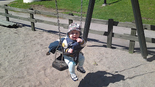Vi mumsade och Liam låg på golvet och vände sig hela tiden, snacka om att man måste börja hålla koll på honom nu. snart springer han väl omkring, nejdå men det står nog inte på förens han kryper. Efter maten så gick vi ut på en promenad. Vi stannade till utanför mormor där det finns gungor för vi tänkte att Liam skulle få gunga lite. Och om han tyckte det var kul, han älskade det. Skrattade och såg så glad ut. Skuggorna var väldigt intressanta:) Efter gungningen så satt vi på en bänk i solen och bara mös. Gud vilket fint väder det har varit idag.